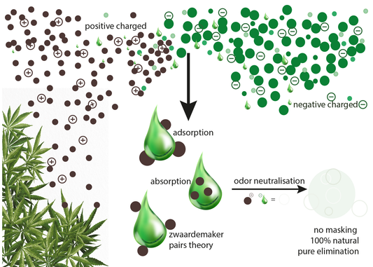 The odor neutralization of cannabis takes place through adsorption + absorption + chemical reaction/elimination (Zwaardemaker pairs theory) and + & - ions (Van der Waals forces).
